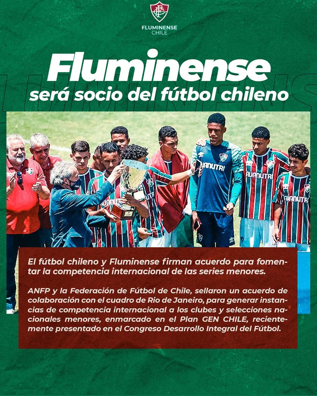 Además de la escuelas recreativas y formativas, gracias al trabajo y crecimiento de la filial en nuestro país, Fluminense es socio del fútbol chileno. El club de Rio de Janeiro, llegó un acuerdo de colaboración con la ANFP y la Federación de Fútbol de Chile, para generar instancias de competencia internacional a los clubes y selecciones nacionales menores,